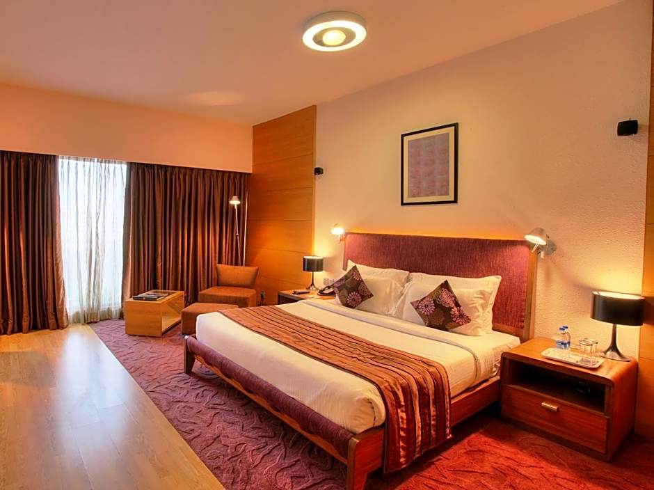 Spacious, luxurious room offers a home theater system and bathroom with black granite finishing.